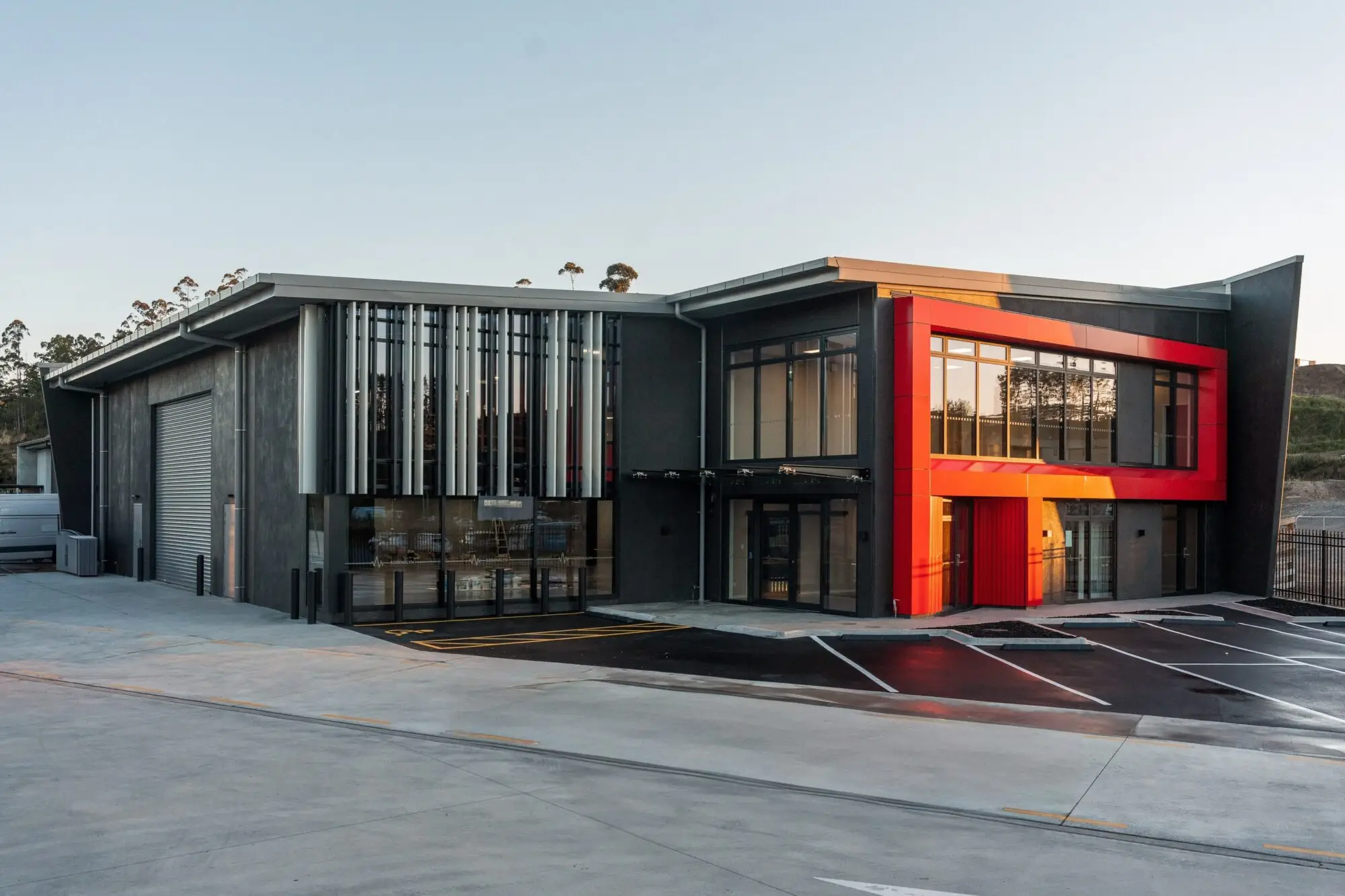 - A striking red aluminium composite panel façade at the office entry